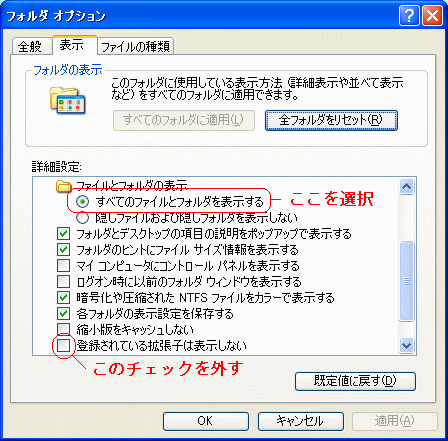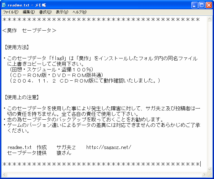 | このページはセーブデータの使用方法を解りやすく説明するページです。 使い方が解らないと言って人に聞くのは簡単ですがそれでは進歩がありませんので頑張って覚えて下さい。 1.セーブデータうんぬんの前にまず始めにこれだけはやって欲しい事 ・圧縮・解凍(展開)ソフトを用意する ・Windowsの一部の設定を変更する 2.圧縮してあるセーブデータをダウンロード 3.圧縮してあるセーブデータを解凍(展開)する 4.セーブデータを使用する 5.よくある質問 ・掲載されているセーブデータを使用したいのですが有料ですか?無料ですか? ・セーブデータの場所がわからない ・ダウンロードした圧縮してあるセーブデータの中にセーブデータが入っていないのですが… 1.セーブデータうんぬんの前にまず初めにこれだけはやって欲しい事 ・圧縮・解凍(展開)ソフトを用意する 当サイトでダウンロード出来るセーブデータは圧縮されていますのでそのままではご使用頂けません。 そこで圧縮してあるセーブデータを解凍するのが圧縮・解凍(展開)ソフトです。 ここではLhasaというソフトを紹介致します。ダウンロードはこちらから。 ダウンロード出来たらダブルクリックしてインストールして下さい。 ![]() ↑インストール先はご自由に ![]() ↑こんな感じで設定して下さい(詳しい使用方法はLhasaのマニュアルをご覧下さい) ・Windowsの一部の設定を変更する 具体的には下記2点を変更して下さい 1.全てのファイルを表示するようにする セーブデータの中には意図的に隠しファイルになっていたり隠しフォルダに 保存されていたりして初期状態では画面上に表示されないものがあります。 そのようなファイルを画面上に表示されるように変更します。 変更後(半透明に表示されます)2.ファイルの拡張子を表示するように変更する 拡張子は見えていた方が何かと便利なのです。 変更前 変更後[スタート]→[コントロールパネル]→[デスクトップの表示とテーマ]→[フォルダ オプション] で設定を変更して下さい。 ![]() 2.圧縮してあるセーブデータをダウンロード 必要な圧縮してあるセーブデータを実際にダウンロードして下さい。 InternetExplorerならダウンロードしたいタイトルの圧縮してあるセーブデータの容量が書いてある所をクリック! ![]() 3.圧縮してあるセーブデータを解凍(展開)する ダウンロードした圧縮してあるセーブデータをLhasaのショートカットにドラッグ&ドロップします。 ![]() ↑今回は臭作の圧縮してあるセーブデータ(syuusaku_saru.LZH)で説明しております 解凍すると、この場合は「readme.txt」(説明書)と「flag9」(セーブデータ)が解凍されます。 ![]() 4.セーブデータを使用する 添付のreadme.txt(説明書)の使用方法をよく読んでご使用下さい。 ![]() 5.よくある質問 ・掲載されているセーブデータを使用したいのですが有料ですか?無料ですか? 無料ですのでご自由にどうぞ。 ・セーブデータの場所がわからない 添付のreadme.txt(説明書)を良く読んでもセーブデータがどこにあるかわからない場合は ・Windowsの一部の設定を変更するの「全てのファイルを表示するようにする」の設定をした上で [スタート]→[検索]→[ファイルとフォルダすべて]で検索してみましょう。 Windows2000,XPでは「C:\Documents and Settings\ユーザー名\Application Data\」が 隠しフォルダになっているので添付のreadme.txtで下記のような指定をしているソフトはご注意を! > セーブデータの場所はWindowsのバージョンによって違います。 > 各バージョンごとのセーブデータの場所は以下の通りです。 > Windows98,SE,Me > C:\WINDOWS\Profiles\ユーザー名\Application Data\ま〜まれぇど\こんねこ\ > Windows2000,XP > C:\Documents and Settings\ユーザー名\Application Data\ま〜まれぇど\こんねこ\ > 指定のフォルダに存在しない場合はWindowsのファイルの検索機能で各自調べてご使 > 用下さい。 ゲームのインストール直後はセーブデータが存在しない場合があります。 その際はゲーム内で一度セーブをしてセーブデータが存在すると思われる状況にして下さい。 (レジストリにセーブするタイプのソフトでは上記方法では見つかりません) ・ダウンロードした圧縮してあるセーブデータの中にセーブデータが入っていないのですが セーブデータが意図的に隠しファイルになっている為に入っていないように見える場合があります。 ・Windowsの一部の設定を変更するをもう一度良く読んで「全てのファイルを表示するようにする」の設定をして下さい。 |